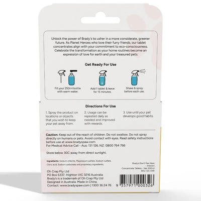 Make the smart investment in your home and your pet’s wellbeing today. Experience the Modern Pets difference and discover why Australian pet owners consider Brady’s Don’t Pee Here Spray Tablet an essential part of their pet care routine.